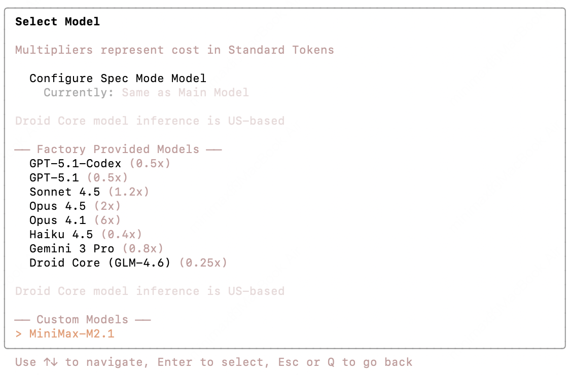 /model, 选择 “MiniMax-M2.1” 模型,并在 Droid 中使用