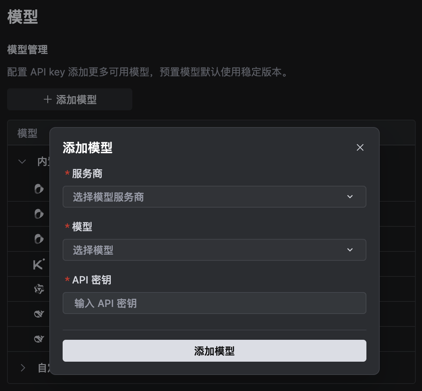 若你希望在服务商平台上管理 API 密钥,可以点击 获取 API 密钥 按钮,TRAE 会为你打开对应服务商的 API 密钥配置页面。