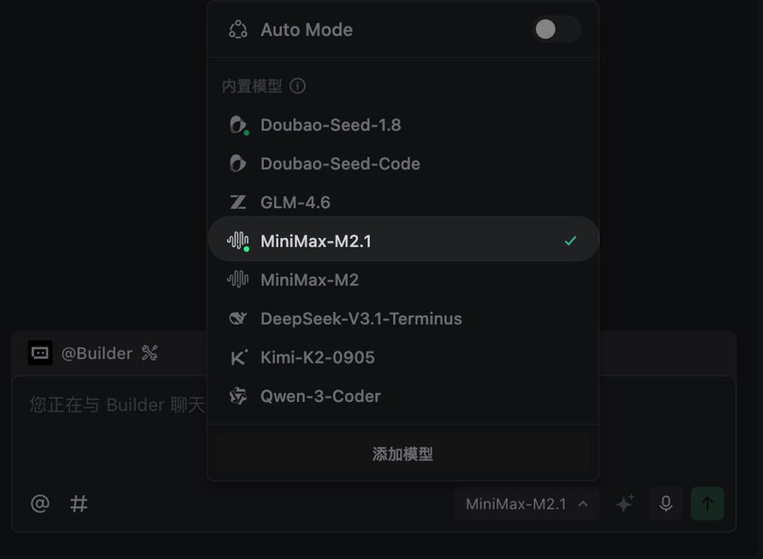 TRAE 中国版内置了 MiniMax-M2.1 模型,你可以直接选用,开启高效编程之旅