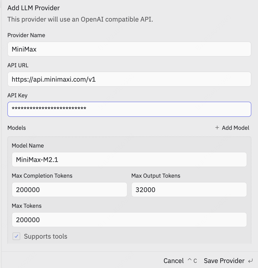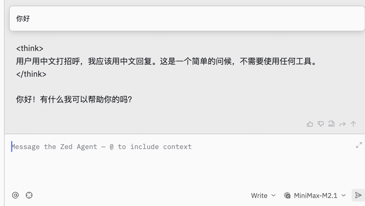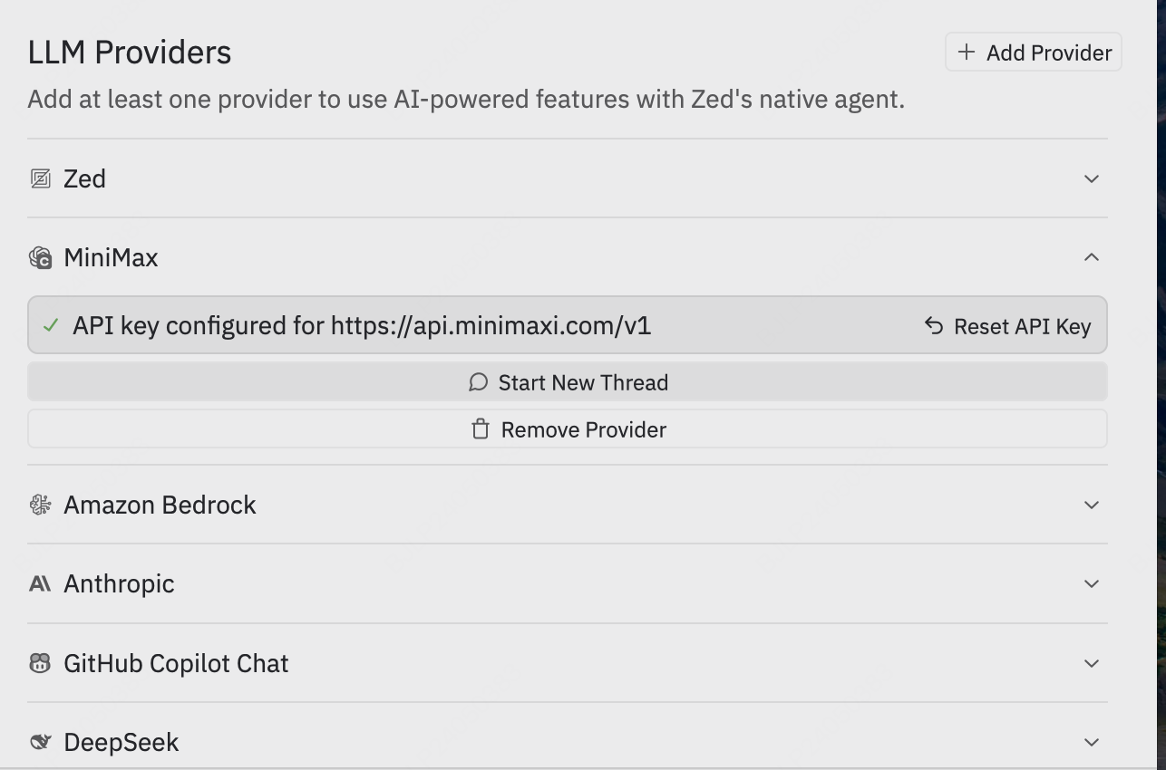 按照 Zed 官方文档 完成 Zed 安装配置。配置 MiniMax API