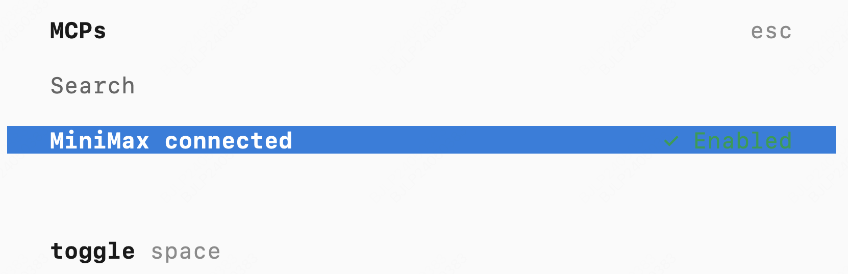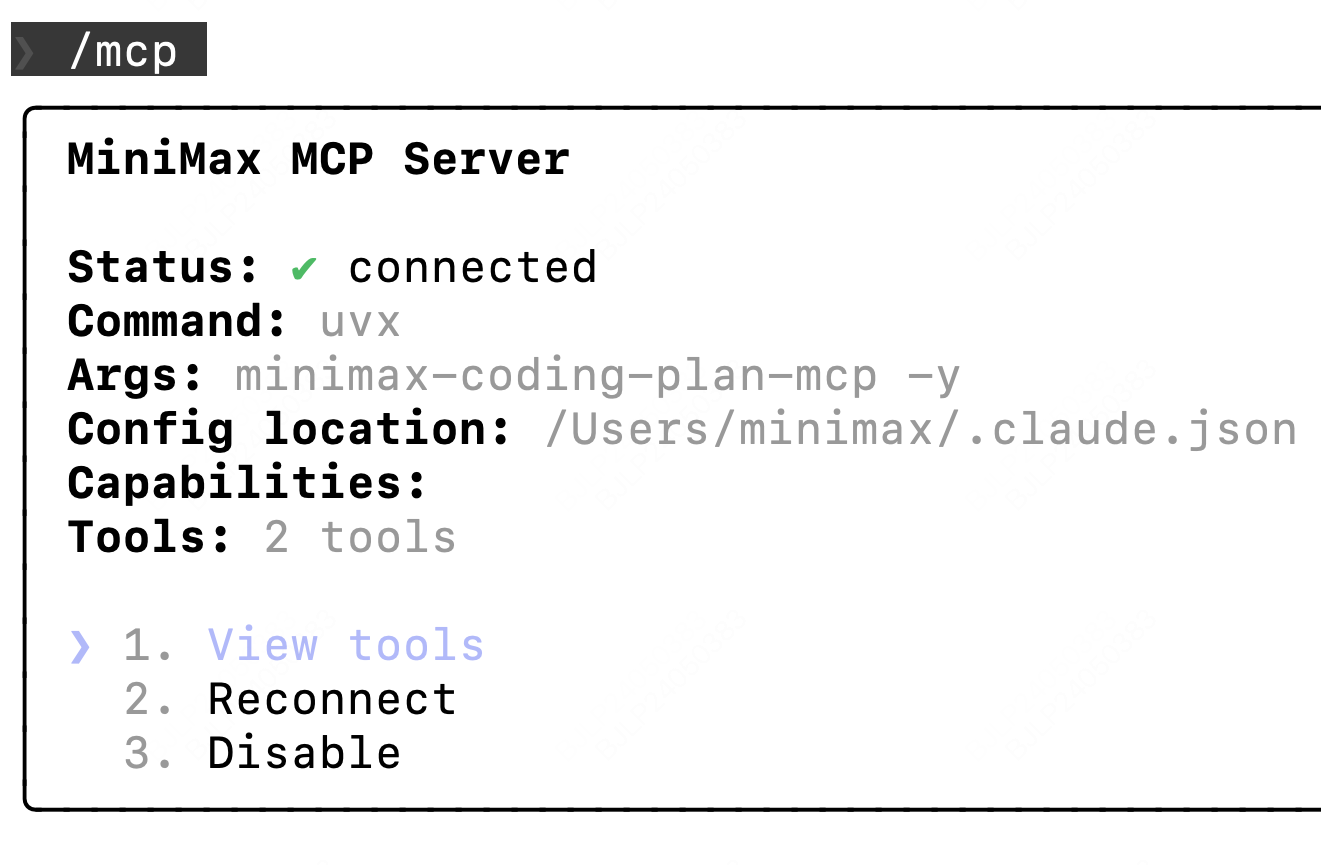 /mcp,能看到 MiniMax connected,说明配置成功。