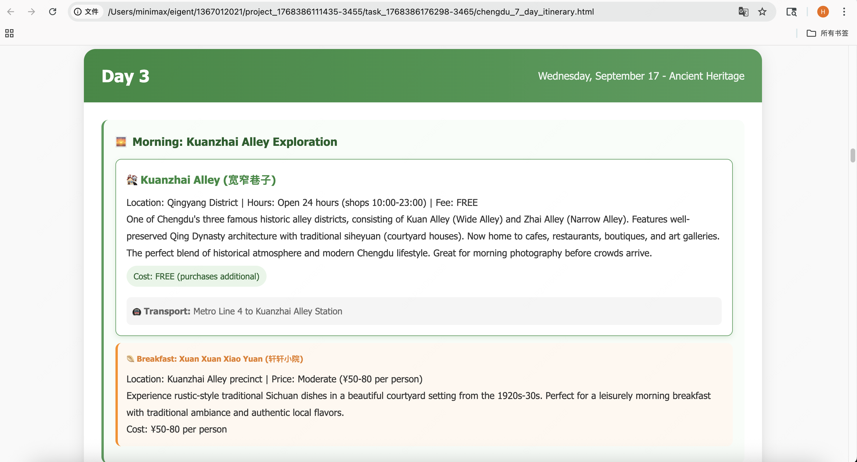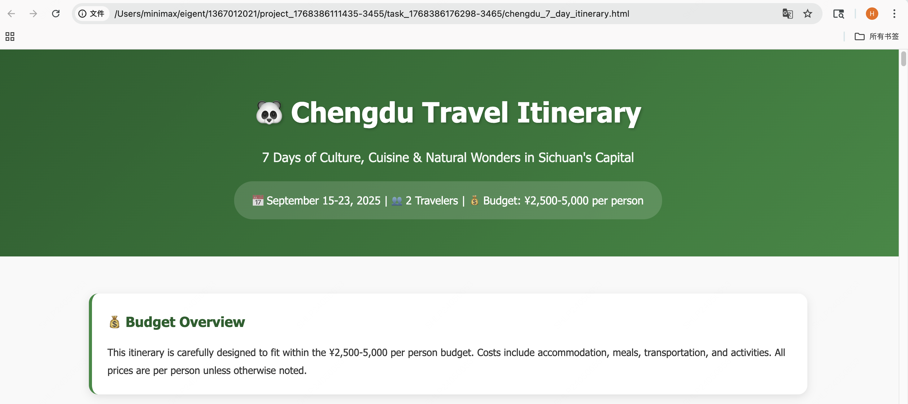 - 最终输出完整的 HTML 旅行手册,展示了 MiniMax M2.1 在长程规划任务中的卓越表现