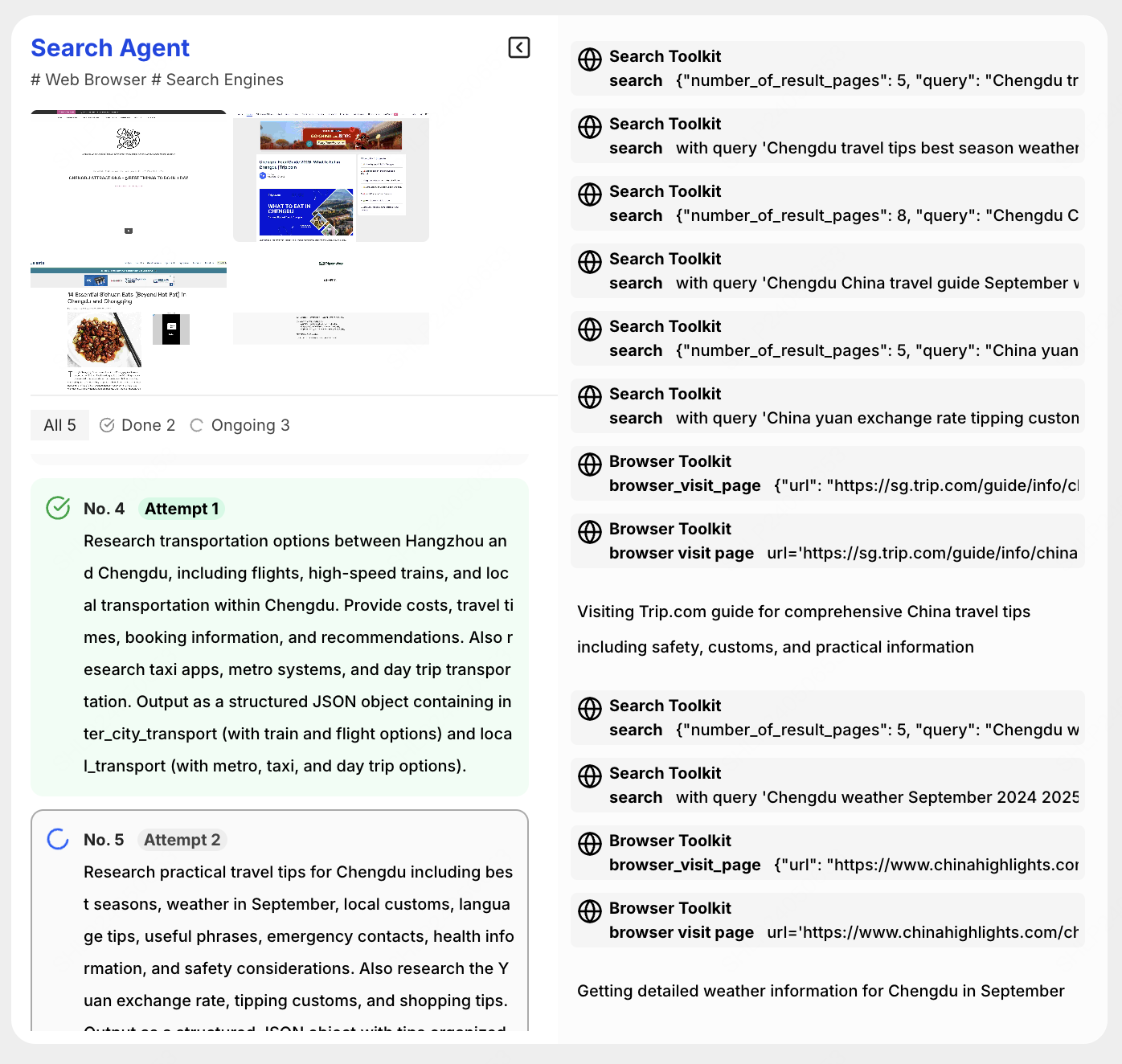 根据任务规划,MiniMax M2.1 模型作为 Search Agent 调用搜索工具,开展搜索任务。在 Eigent 框架中,5 个搜索任务并行执行。
