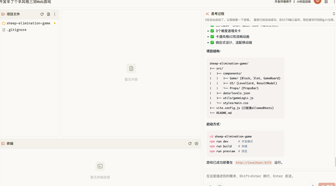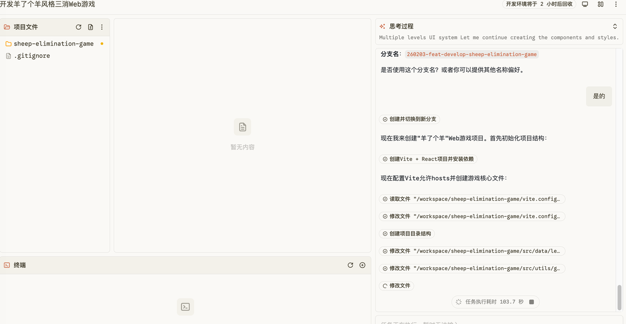 2xxxxx-feat-develop-sheep-elimination-game,在终端需要输入指令确认创建并切换分支。之后 MonkeyCode 会自动初始化项目结构、安装依赖、配置 Vite 环境(允许 hosts 访问)。