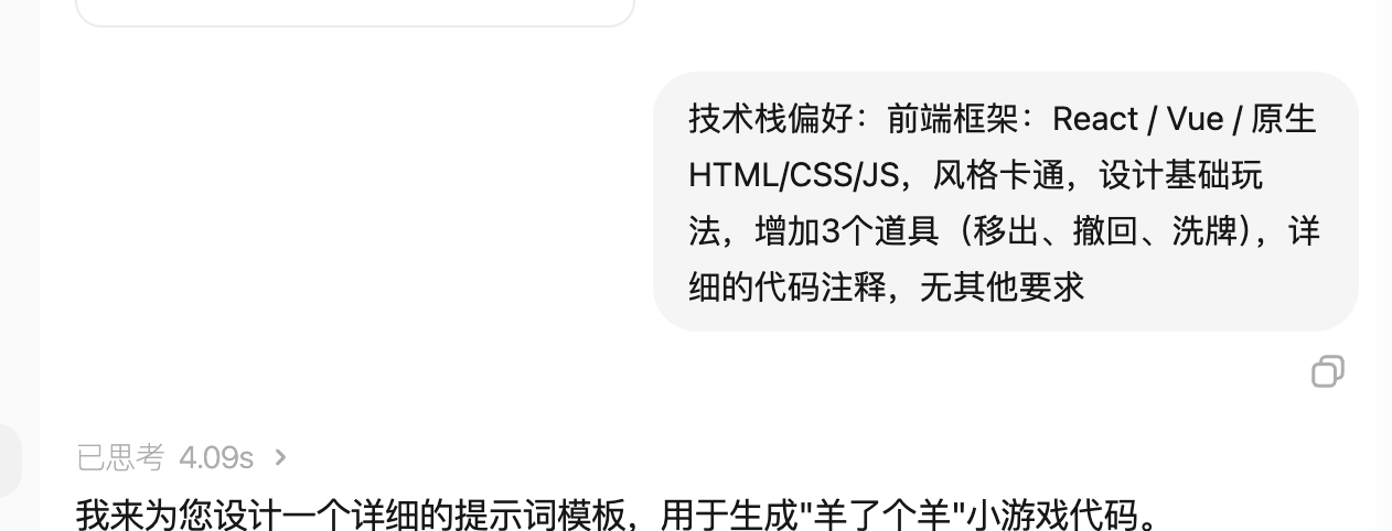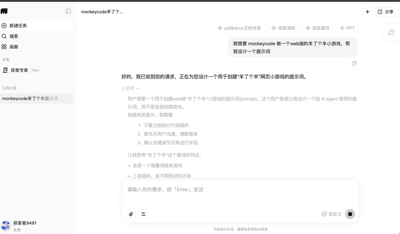 向 MiniMax Agent 提交基础开发诉求,明确游戏类型、核心要求:我需要设计一个给 AI Agent 使用的提示词,用于在 MonkeyCode 中开发 Web 端「羊了个羊」小游戏,请协助完善提示词细节。