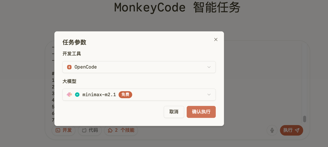 访问 MonkeyCode 官网 进行登录。如需配置个人 MiniMax-M2.1 接口,请参考 MonkeyCode 接入指南。2. 提交开发任务