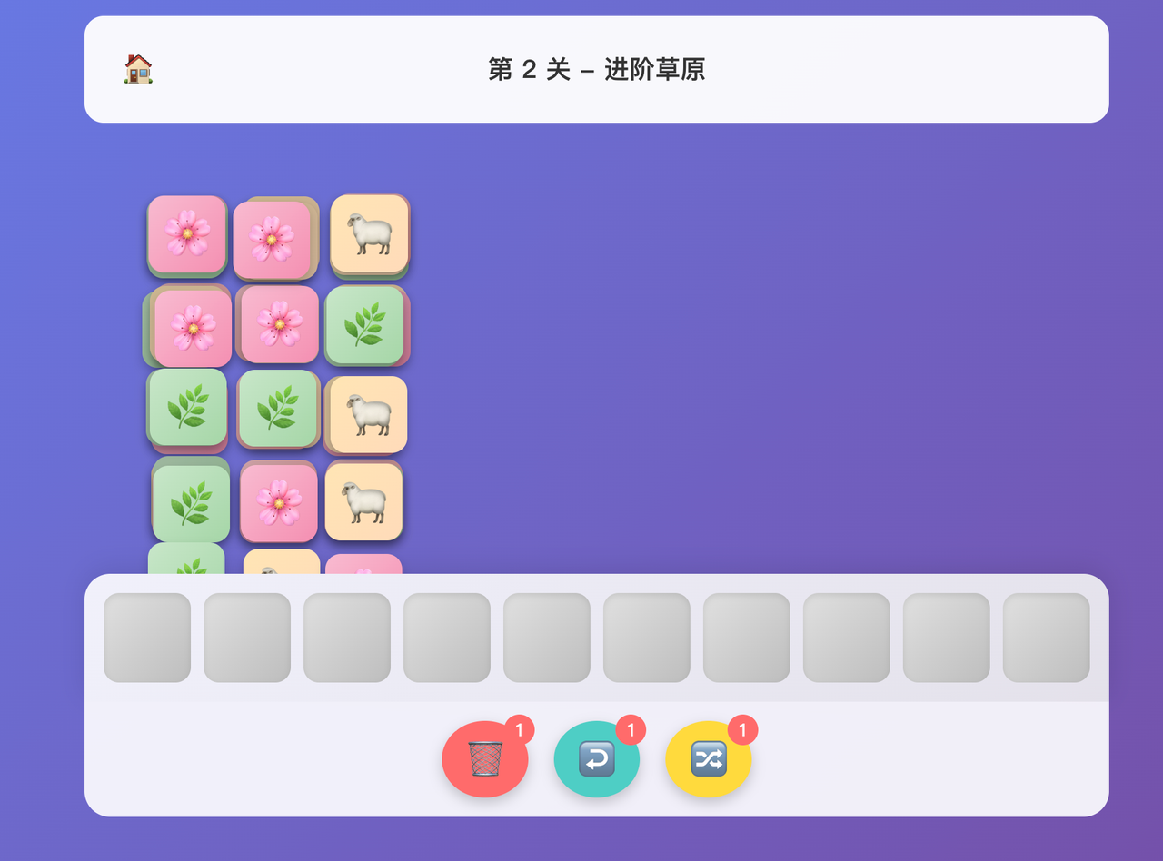 - 关卡设计:包含 3 个难度递增关卡(新手牧场 → 进阶草原 → 高级山脉),关卡难度差异为方块类型数量增加