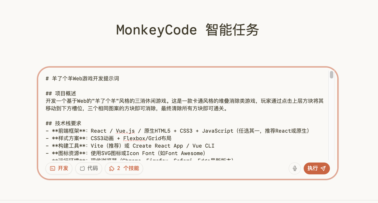 本教程将指导您如何通过 MiniMax Agent 设计精准开发提示词,在 MonkeyCode 平台接入 MiniMax M2.1 模型,快速开发一款具备完整玩法的 Web 端「羊了个羊」风格三消休闲游戏。全程无需手动编写核心代码,借助 AI 实现从需求定义到项目部署的全自动化开发,支持多技术栈选择、道具系统集成和多关卡设计,适配 PC 与移动端。 核心亮点:- 计时 304.5 秒完成项目初始化与核心开发